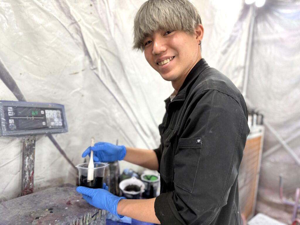 鈑金塗装一筋30年の大ベテランの新井渉さん(51歳)と、鈑金塗装歴3年のフレッシュな若手、大木裕太さん(28歳)です。(詳しくはこちらを参照)